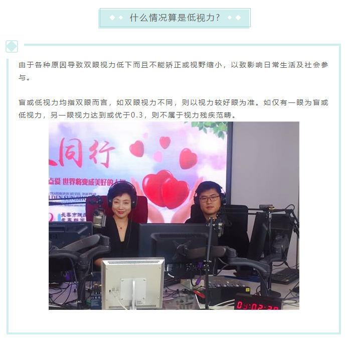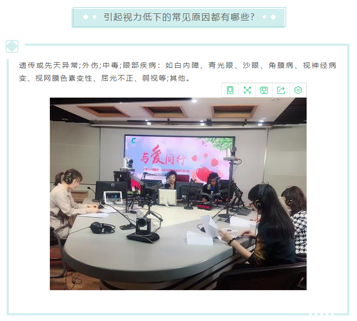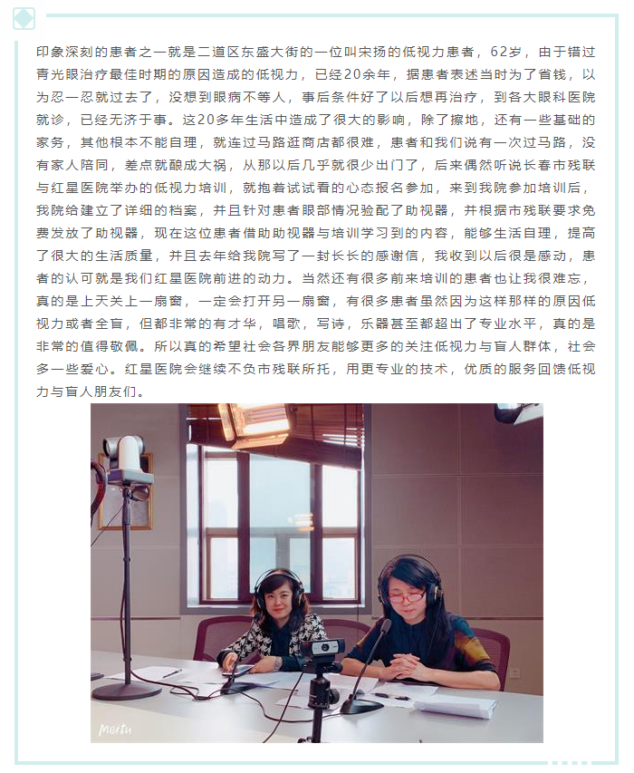 6月5日长春红星医院苏院长、医疗副院长王宝艳、运营副院长张敏受邀参加,由长春新闻综合广播和长春市残联共同打造的直播访谈类节目《与爱同行》 ,随着人们生活方式的改变,临床上低视力患者的人数明显增加,并且朝着低龄化的趋势发展。在节目中就低视力儿童和低视力适配相关问题进行了细致的解说。